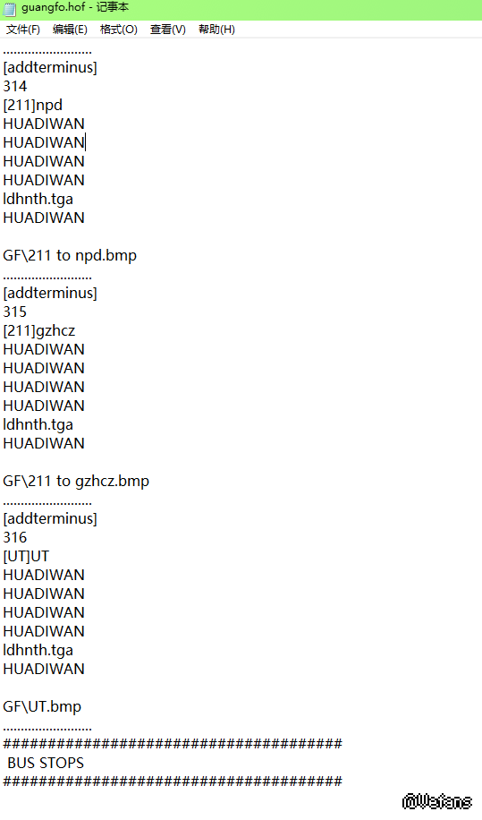 标红色的是要修改部分,314代表TERMINI栏的序号,[211]npd代表终点站,GF\211 to npd.bmp代表读取位置。