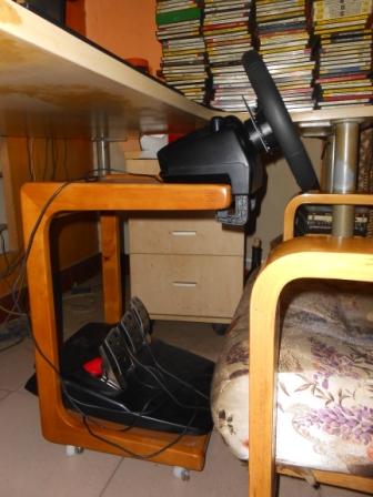 因为我的桌子比我坐的单人沙发高,所以把方向盘固定在桌沿上会阻挡视线,我就开始想怎么把方向盘固定的位置降下来。我聪明的脑袋终于想出来一个好办法,于是我今天特意为G27买了一件家具。一个小边桌。它本来是干这个用的。