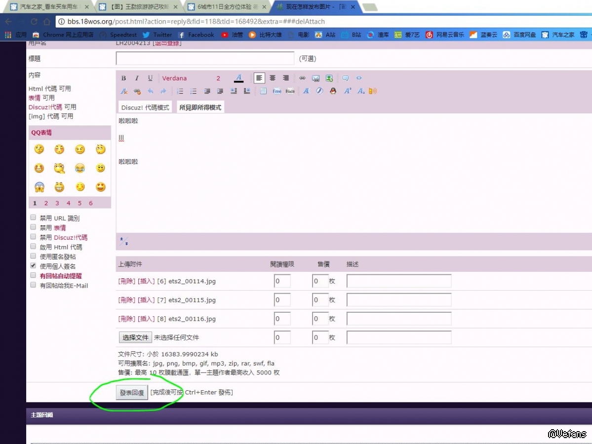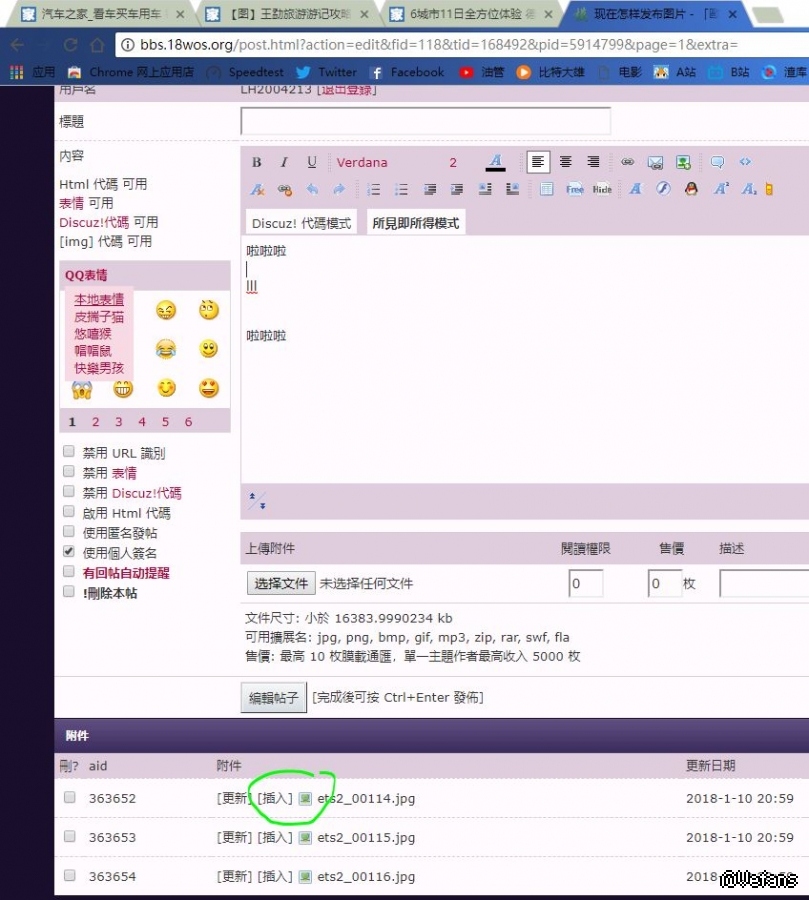 点击上传附件-浏览本地图片后应该显示插入,为什么我这里不显示啊?大家都是怎么发的?谢谢!!!