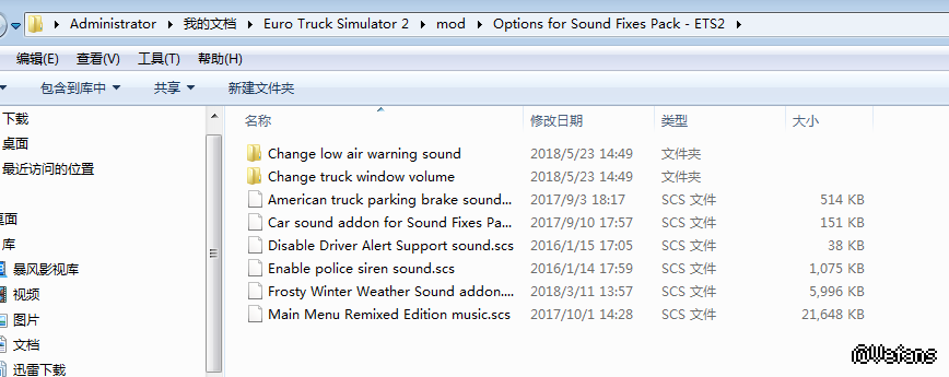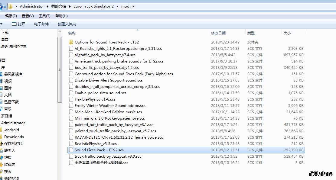 欧卡2新的声音修复包 v 18.12下载下来后解压缩后发现里面有很多文件,将Sound Fixes Pack - ETS2这个文件放到了mod文件夹里了