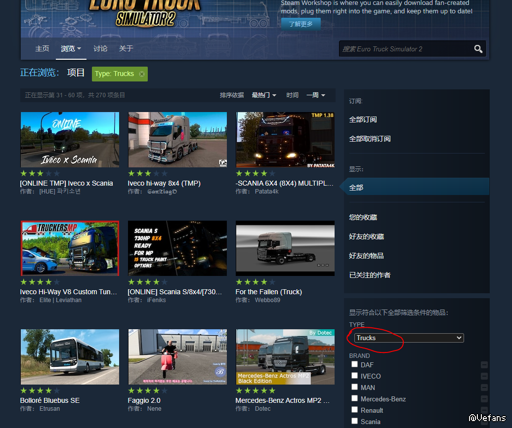 创意工坊右栏的type选项里选择trucks