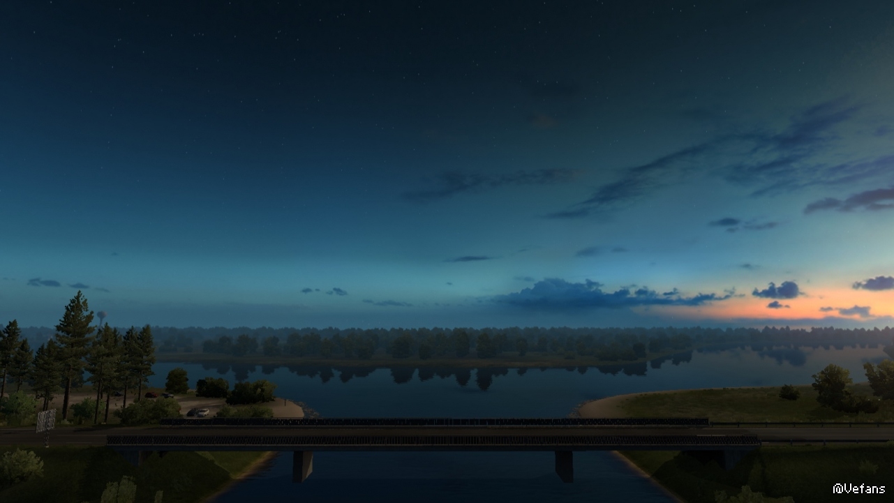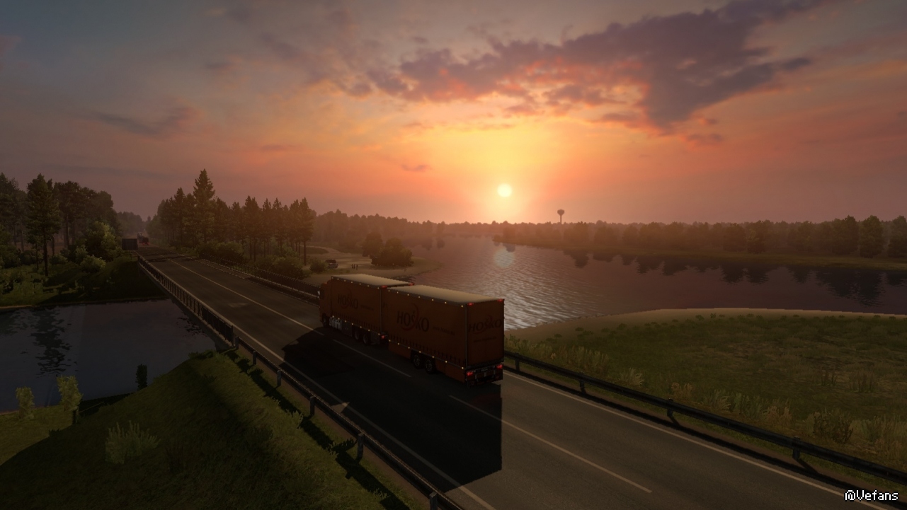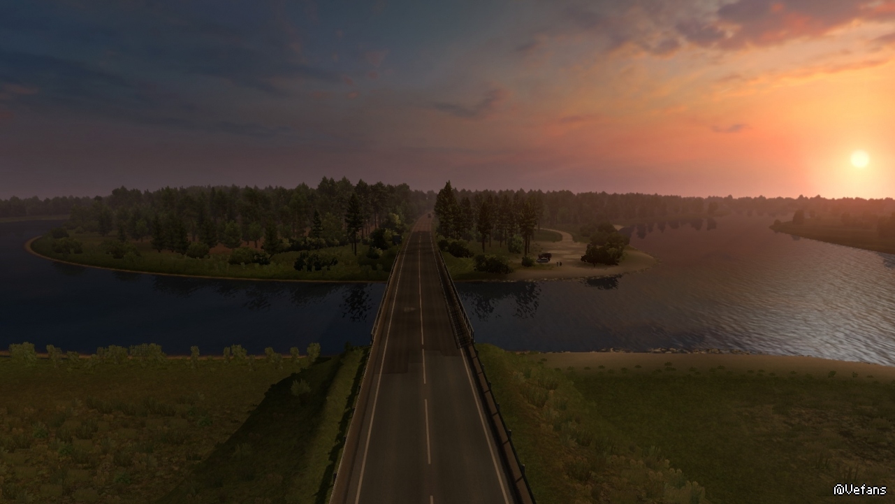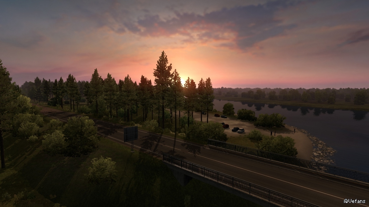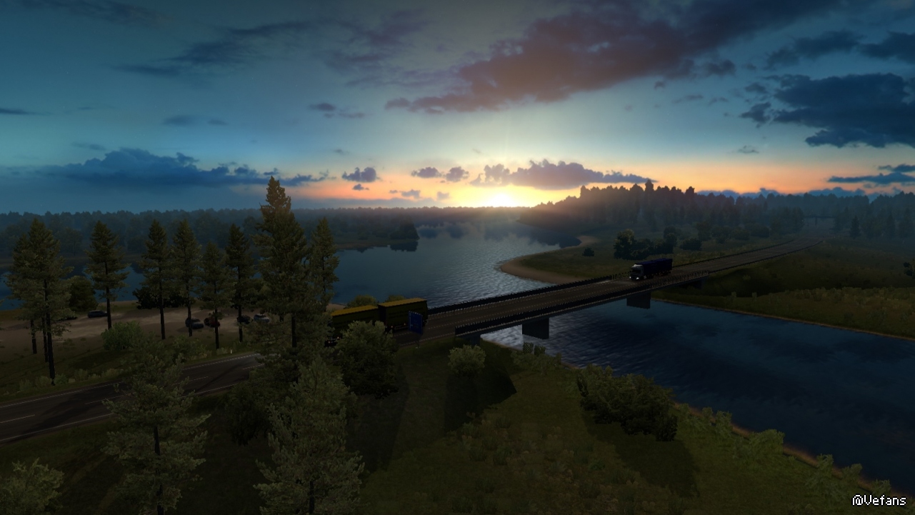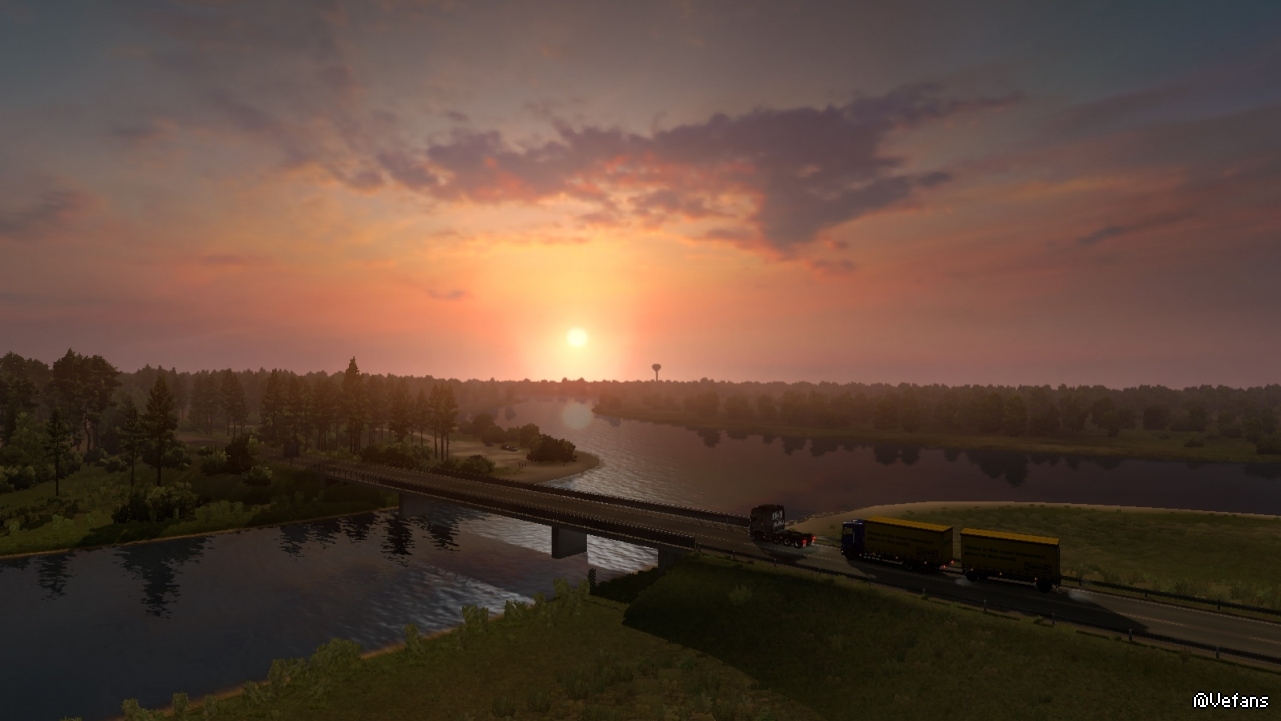 以下这些图来自 ProMods 某路段截图,详细位置没记录(个人比较偏好早晨和黄昏色调)。