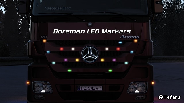 I’m here to present you some nice bling for your trucks, the Boreman LED markers. Made from scratch in Blender Tools, with high quality lamp texture and light mask. Mod supports a wide range of modded trucks.