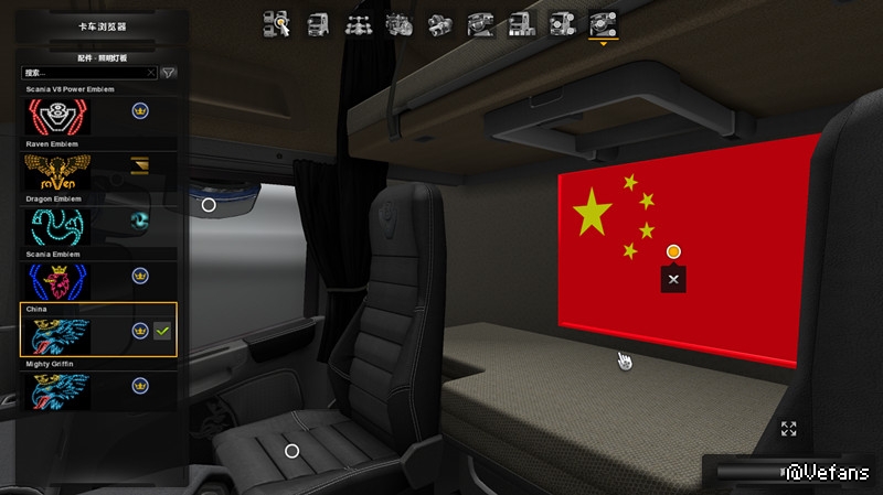 【介绍】:斯堪尼亚室内中国国旗,独立的模型,兼容格里芬背光灯DLC。