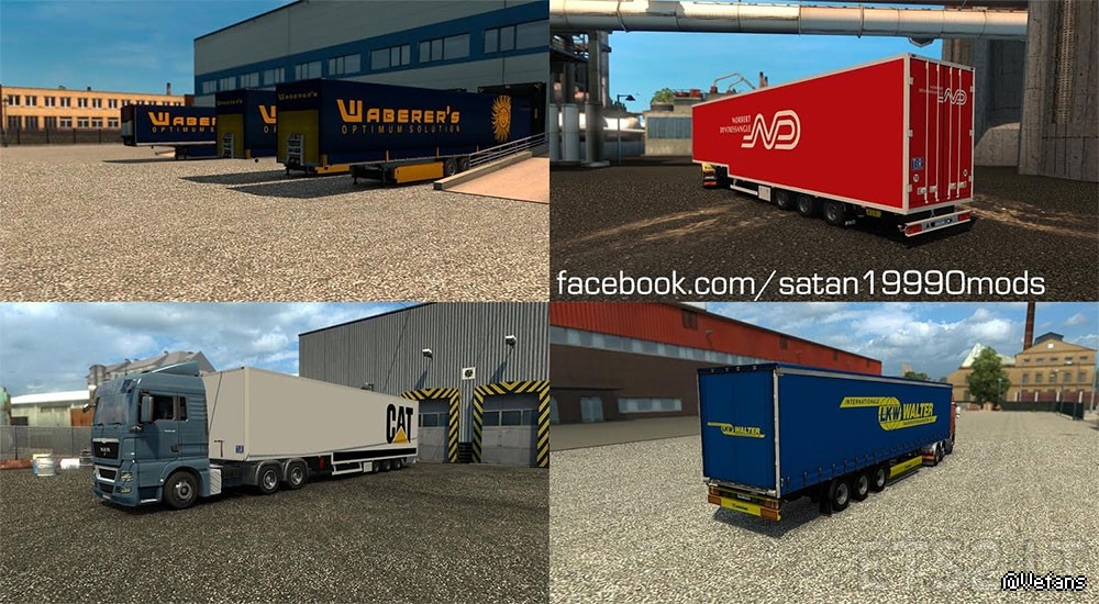 This mod adds total 100 new stand alone trailers and cargo and a lot of new skins. After add mod scroll time in the game to new trailers appears. Mod should work with other mods on the trailers.