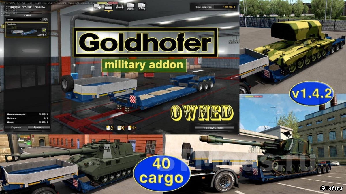 Добавляет 40 военных грузов для низкорамного прицепа Goldhofer (в собственность). Без основного мода не работает, в мод-менеджере должен быть выше него.
