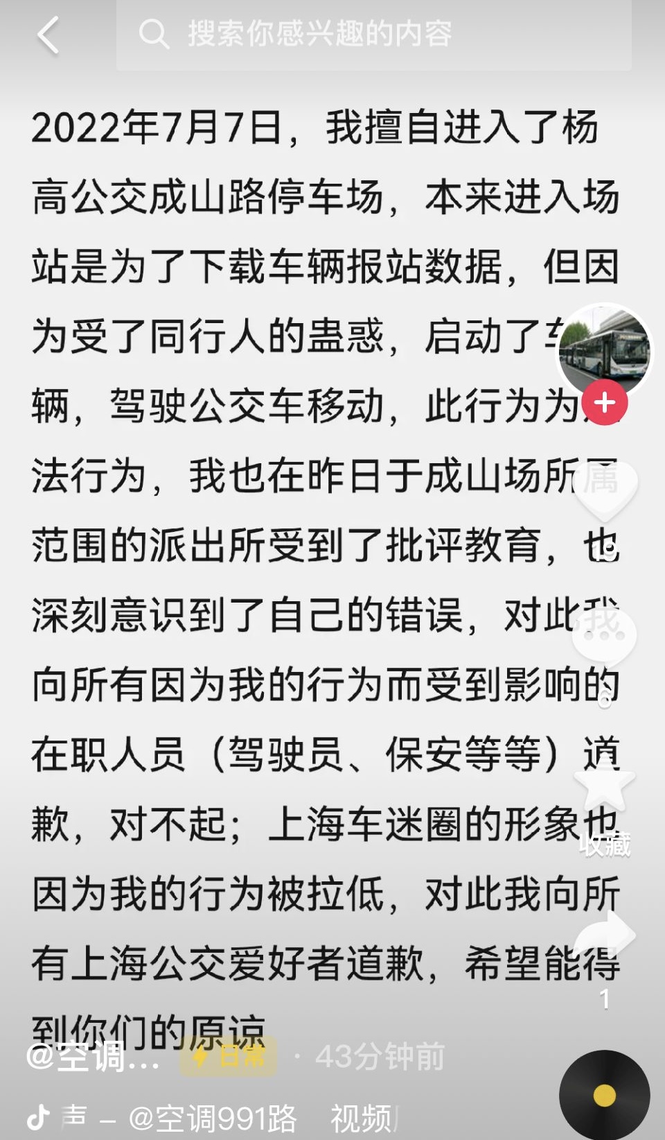 [转载] 上海公交两位“车迷”私自发动公交车