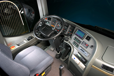 常见大型客车的发动机布置及驱动形式有:前置后驱;后置后驱;中置后驱三种,其中后置后驱又分为纵后置、横向卧置【部分斯堪尼亚城巴采用此形式】、偏置塔式布局【部分安凯客车及北美品牌采用】等;中置分为中置卧式【沃尔沃B10M/B12M采用】和中偏置【金华尼奥普兰25米BRT、vanhool部分车型】。今天为大家带来一组VOLVO中置引擎长途客车图片。这款车采用六缸卧式柴油机和干式油底壳,发动机在车身中央能够为整车带来最优越的动态平衡,同时车辆框架能够对发动机形成很好的保护。这样的设计还能够使车内拥有平坦的乘客空间。但是这项设计的劣势在于发动机的散热比较难以解决,因此厂商将发动机散热器布置在车身左侧,并设计了进风口,增加散热效率。