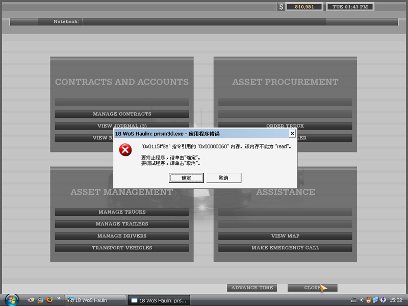 我不管是长拖还是搬运,一卖车后,返回就出错跳回桌面,请高手看看是什么原因,其它操作正常,谢谢!!