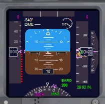 单位英尺,黄色的粗线代表地面海拔,粉色方框代表自动驾驶仪目标高度。它旁边的扇形仪表是垂直速度计。