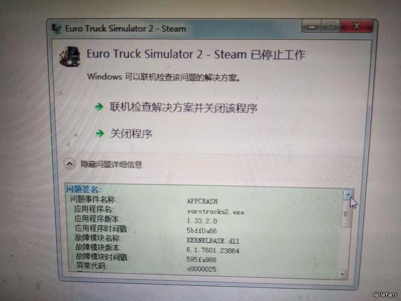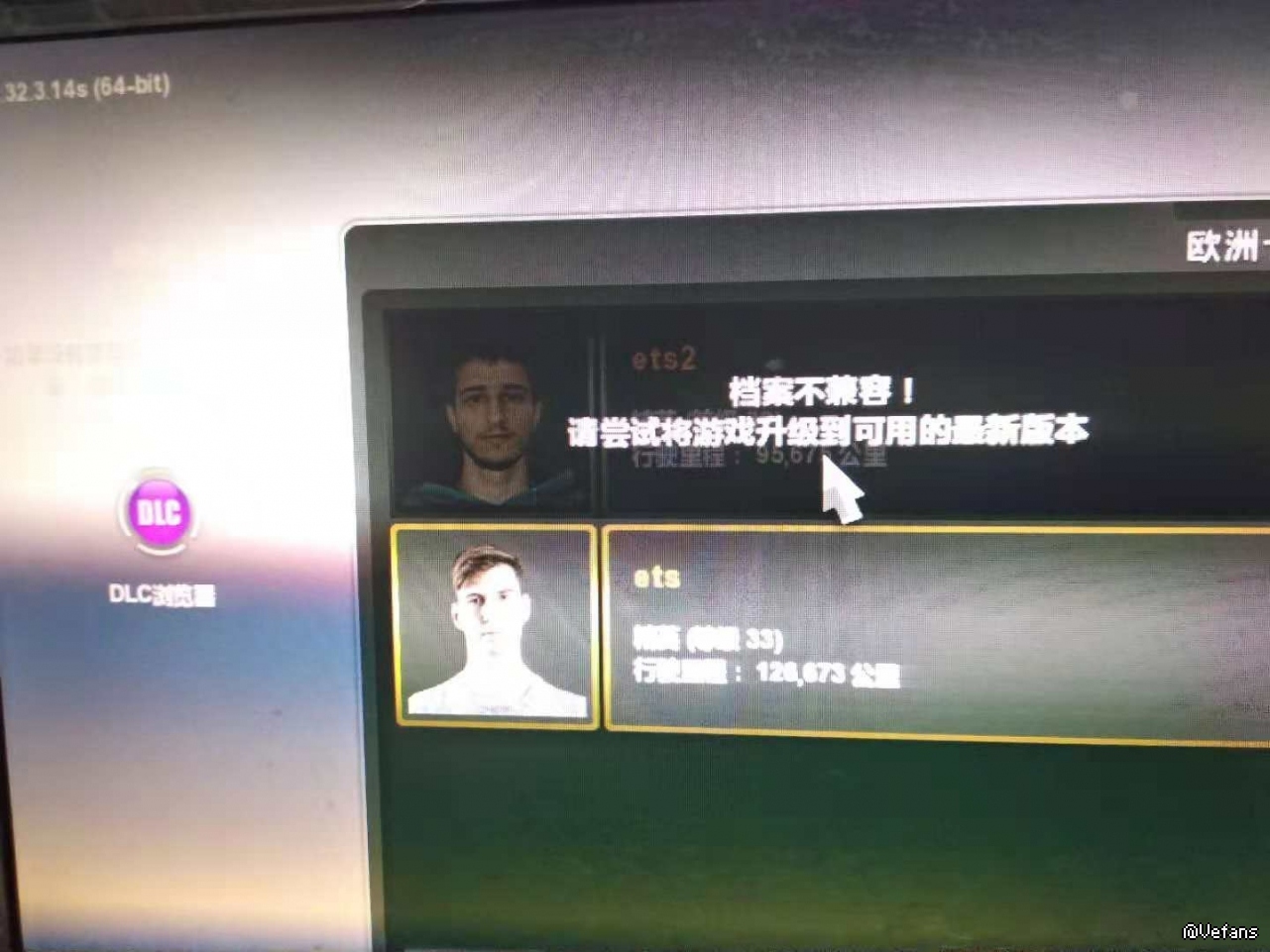 各位好:     之前欧卡2 1.33.1版本出来的时候我下载下来了,我原来的1.32版本里有一个我自己玩的33级的存档,在刚进入1.33版本的时候没有显示存档崩溃,我自己新建了一个新存档想去体验一下1.33版本的内容,发现还没有波罗的海DLC就出来了,后面再进去1.33.1版本就显示Euro Truck Simulator-Steam 已停止工作,我玩的是非STEAM版本的。现在我进我还保留的1.32版本里,那个33级的存档那里显示需要升级到1.33版本,因为版本不兼容,不知道各位大神能否告知这其中是什么情况?现在下了1.33.2版本,波罗的海版本还是现实进不去游戏!