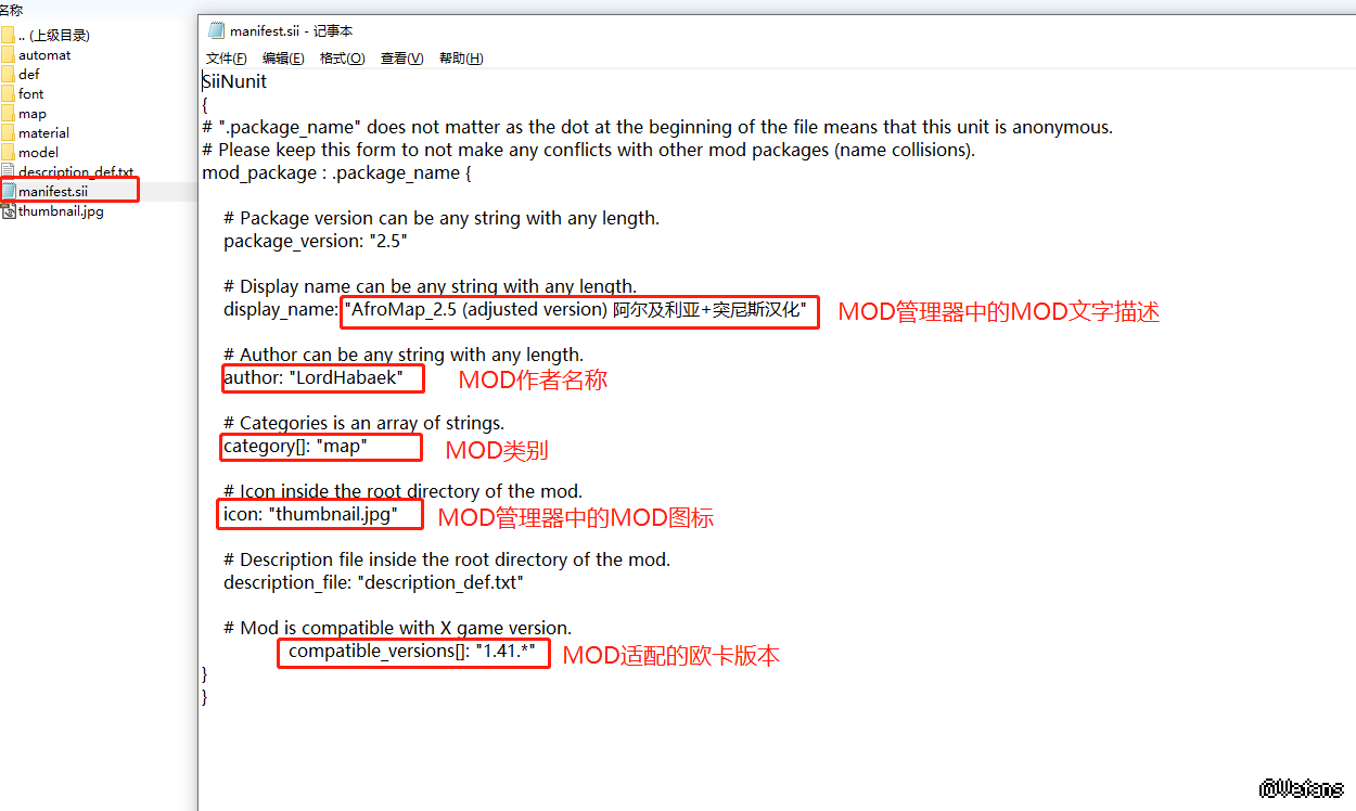3、在打开的SCS中间中,我们可以先看到manifest.sii这个文件,这个文件其实就是一个描述文件,可以用windows自带的记事本打开(注意:是用记事本打开,别用word等其他文档编辑软甲打开)。打开后,就是下图中的内容,对于红框中“”内的文字描述,都是可以修改的。我一般会对MOD的文字描述进行修改,便于在MOD管理器中显示该MOD所起到的作用,便于日常管理。另外,有些MOD的适配版本可能是1.40,有时候我也会改成1.41,然后在1.41的版本中就可以加载这个MOD,当然会不会出问题就要靠自己测试了。