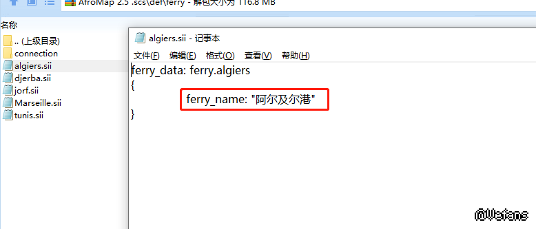 5、这样做个保存就OK了,很简单吧。另外,如果这个城市有港口渡轮的话,也可以同时做了汉化,我们打开Def文件夹下的Ferry文件夹,里面就是港口的SII,我们同样用记事本打开,将ferry_name: "阿尔及尔港"中,双引号内的文字修改为对应的中文描述,就可以了,也很简单吧。