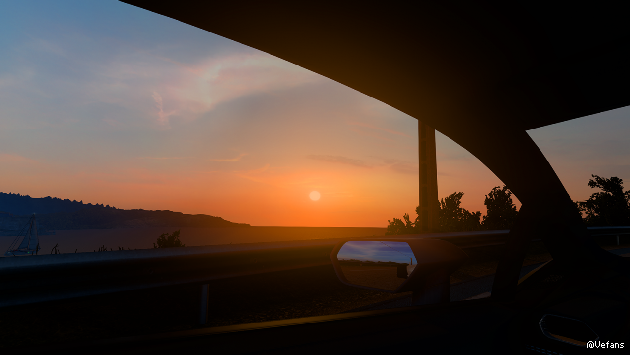 欧卡2里买了辆兰博基尼,跑山路真带劲,路遇夕阳,拍一张!