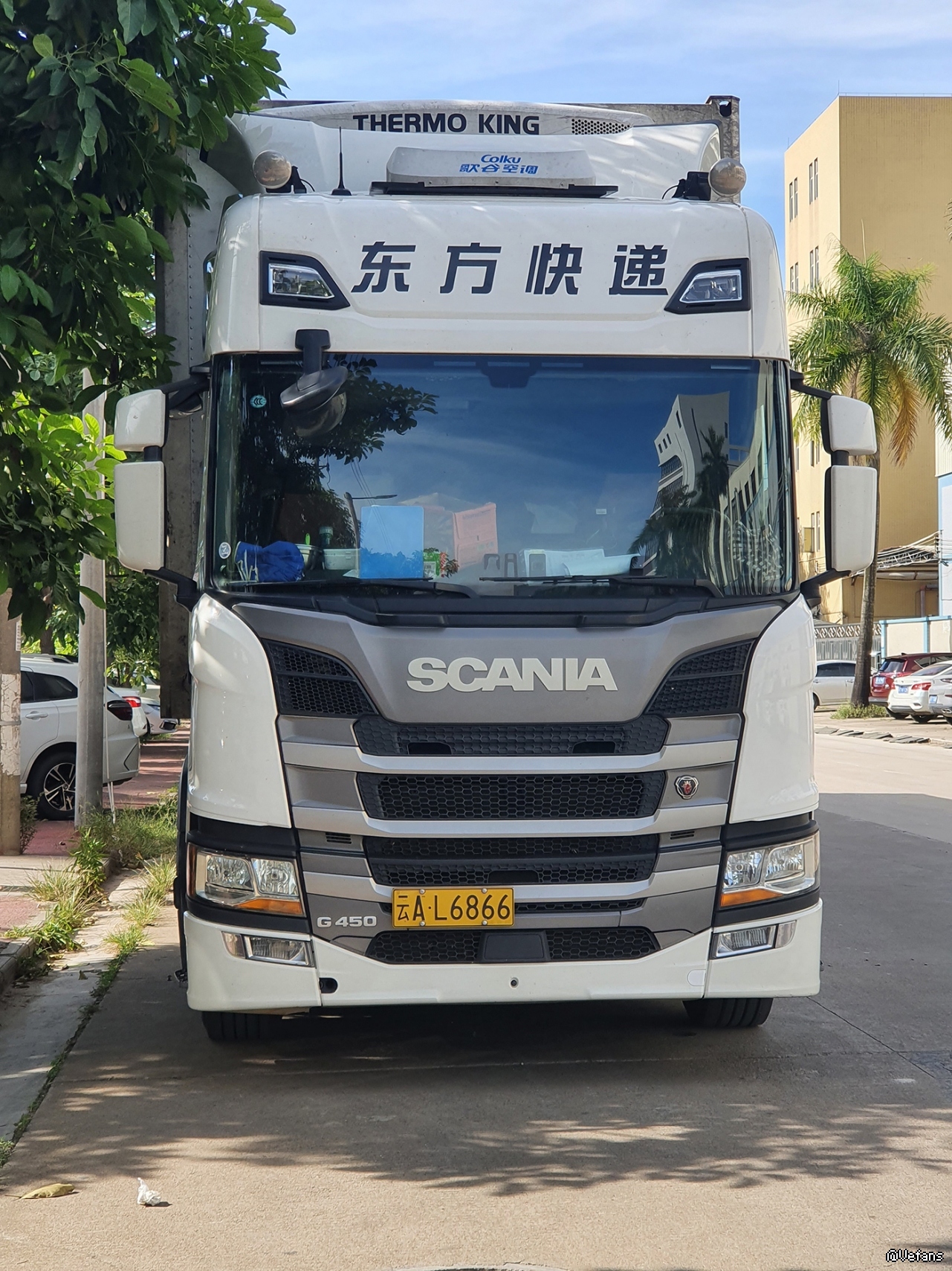 有钱买这车连个遮阳板也不选配!国内挺多买G系跑物流干线的!MP3的正脸好看。我们车小就拉两卷,220马力DC7到80KM/H以上就没有力了!