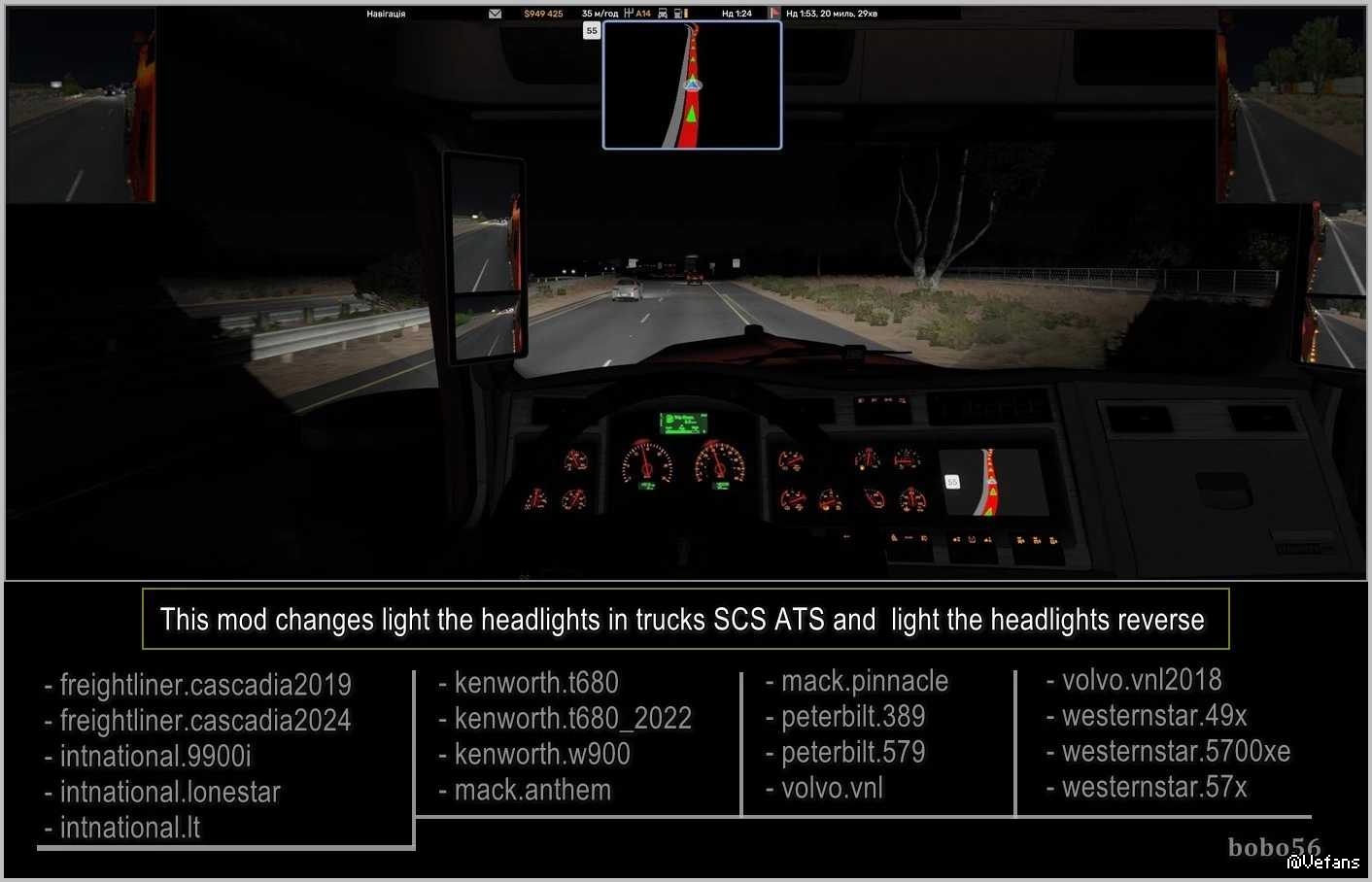 This mod changes light the headlights in trucks SCS ATS and light the headlights reverse