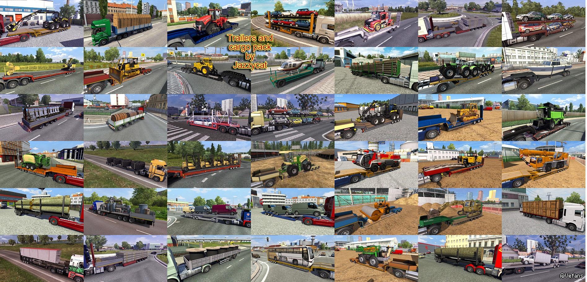 Pack adds in game 146 new models of trailers (different trailers by Kögel, Fliegl, Böse, Närko, Lamberet, Chereau, Schmitz, Bodex, Wielton, Fruehauf, Schwarzmüller, Kassbohrer, Rolfo, D-Tec, Samro, Krone, Pacton, Ekeri, Goldhofer, Kröger, Aydeniz, Nooteboom, Sommer, Estepe, Fontaine, McLendon, Krampe, Kotte, Panav, Kempf, Galtrailer, Michieletto, Groenewegen, Chmzap, Maz, Nefaz, Szap, Tonar, Odaz, Becema and others), 554 new cargo, 633 traffic trailers and over 2500 skins.