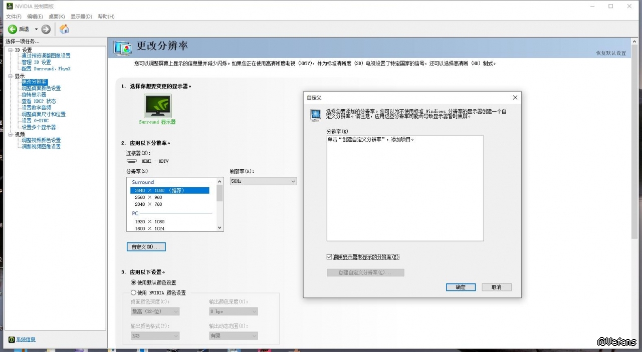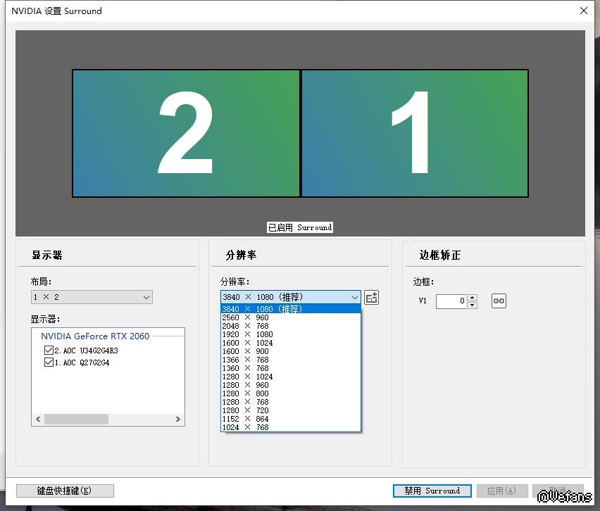 本來是用一塊3440*1440的顯示器玩的,後來有個舊的顯示器(分辨率2560*1440)也接了上電腦,但是顯卡(N卡)設置不能自定義拼接後的實際分辨率6000*1440