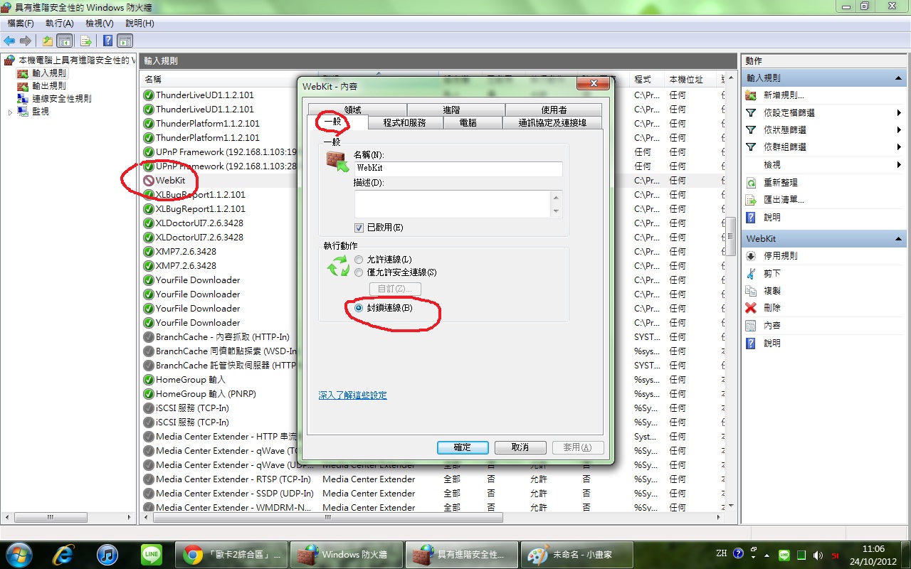 進階設定>輸入規則>webkit>右鍵>內容>一般>封鎖連線