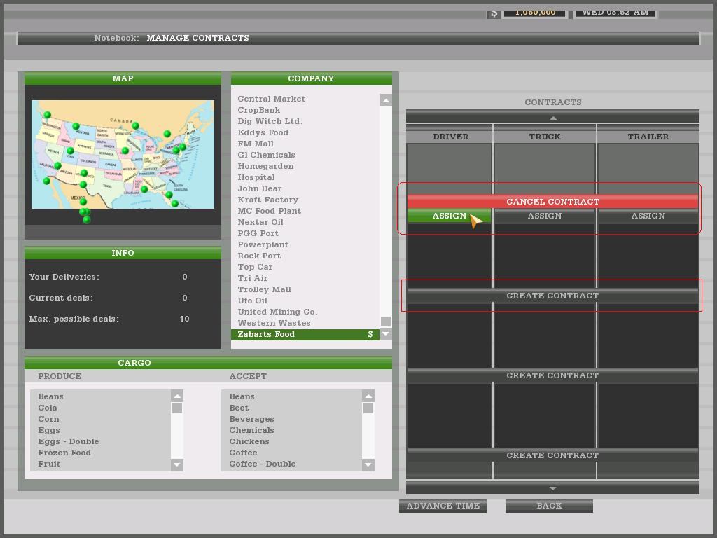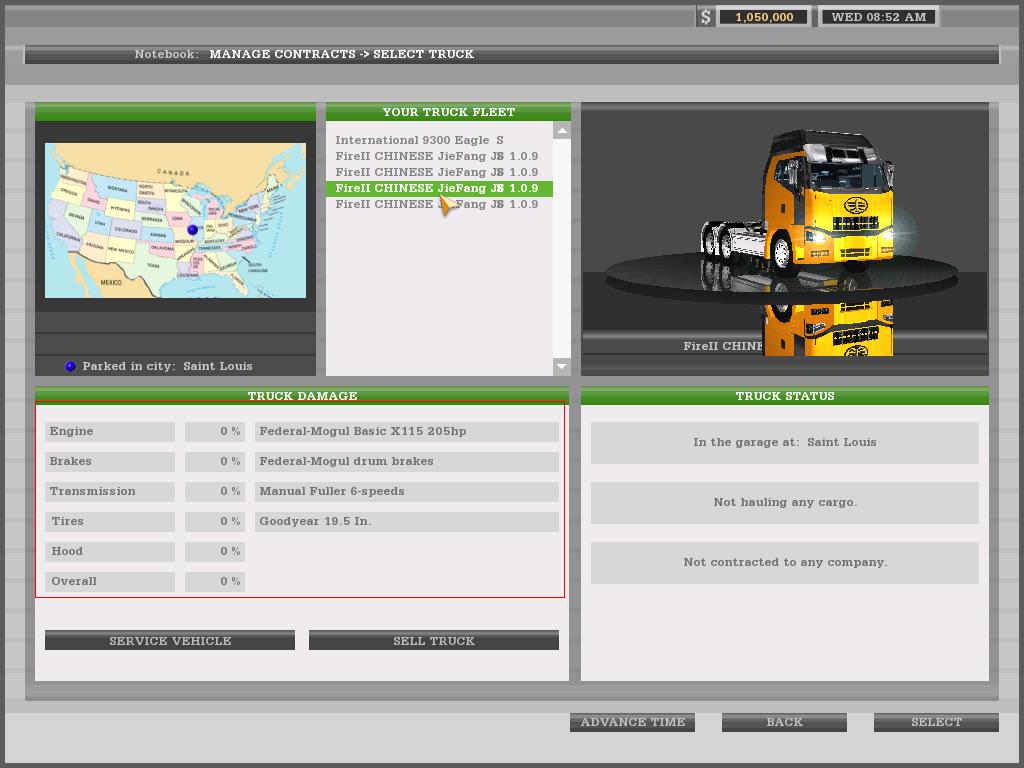 红色框框的地方就是玩家所拥有物流公司的司机出勤情况,左上角的是买新汽车和新货柜的地方。
