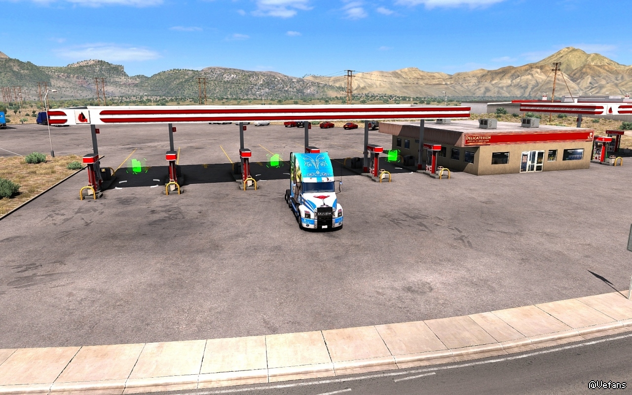 有网友说美卡升級到1.38.1.22,新墨西哥州,阿拉莫戈多的中心加油站,在大馬路側好像有空氣墻,卡車不能過。特意跑去试了一下,还真有这回事呢。从后面可以进去加油,但出不来。图片中的卡车前面有一堵空气墙。