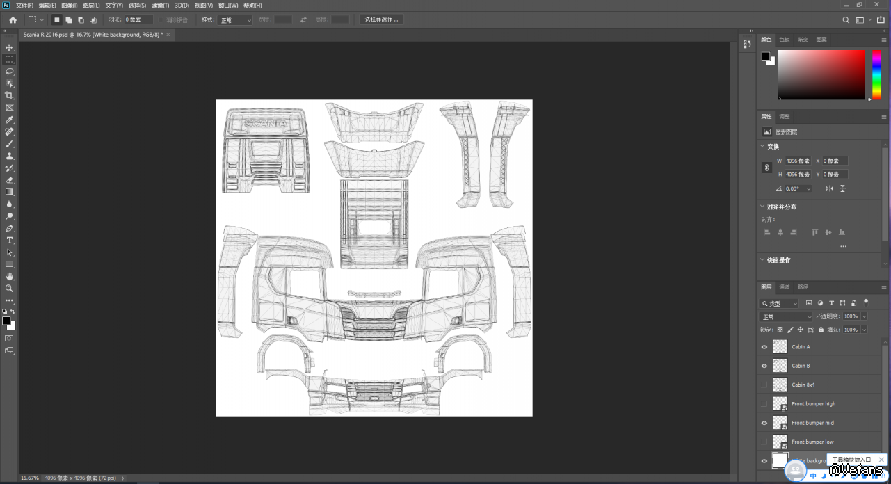 Feel free to distribute these templates as much as you like! - All ETS 2 and ATS trucks and trailers are included, as well as Krone, Schwarzmuller, Mighty Griffin, DAF Tuning Pack and Actros Tuning Pack DLCs - Truck templates are 4096x4096, and trailer templates are 4096x2048 and 2048x2048 - Each template is available in PSD and PNG format - Every ATS truck except the W900 and LoneStar use the alternate uvset - Goosenecks, loggers and (non-sliding tarp) flatbeds aren't really skinnable, so I didn't bother making templates for them For all trucks I've referred to the largest/most expensive cabin as Cabin A, with smaller cabins being called, B, C etc in order. 8x4 cabins are separate where necessary