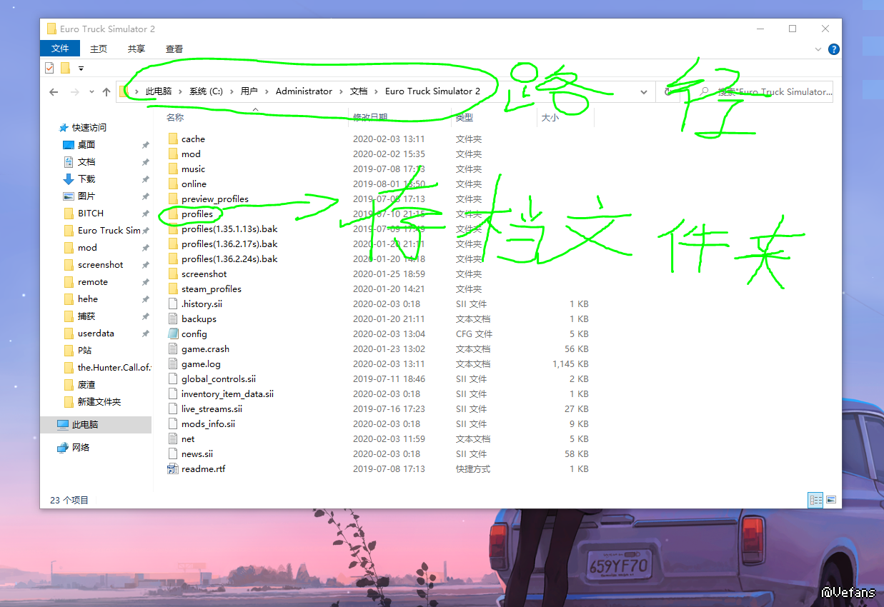 D:\Documents\Euro Truck Simulator 2 如果你的系统做过文档处理的话【新装系统默认是在C盘 不过网上的很多系统做过变更】