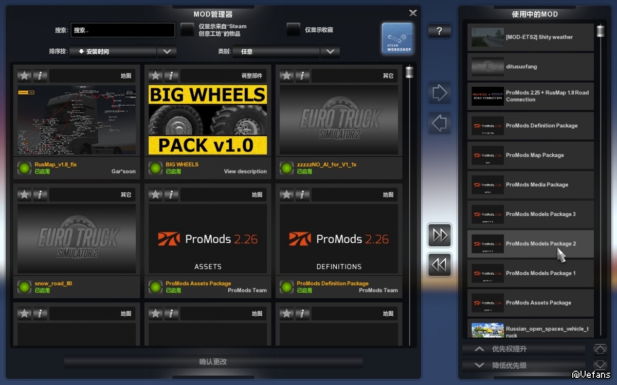 之前玩过俄罗斯开放空间,感觉挺好,于是又下了来玩,但是照这位大神的排序,我电脑自动退出,也不知道是怎么回事。于是我去掉了一些,只留Promods+俄罗斯地图+俄罗斯开放空间+俄罗斯南部,测试退出,再测试再退出......反复折腾几次之后,终于可以玩了。。
