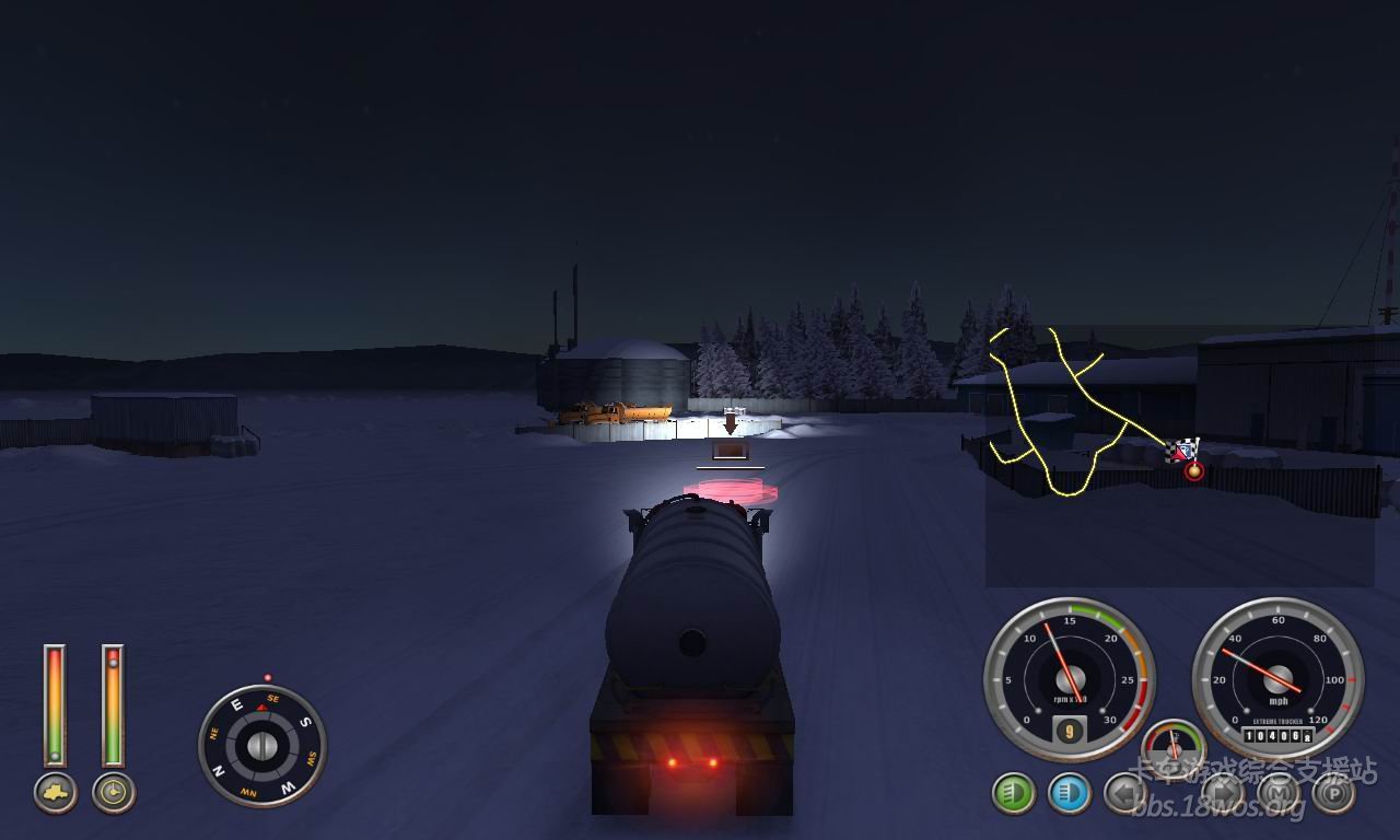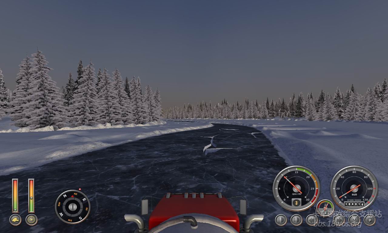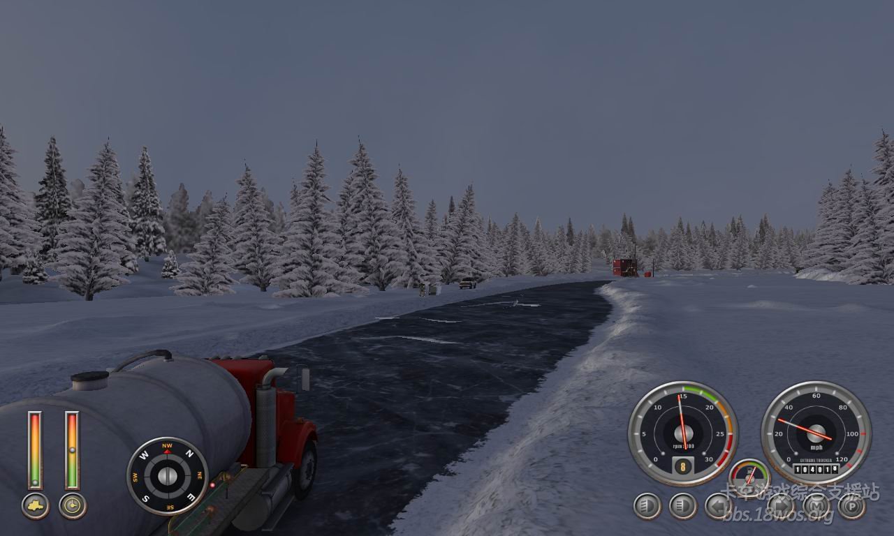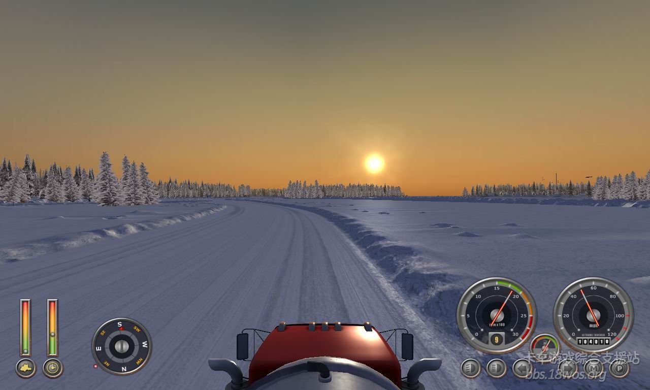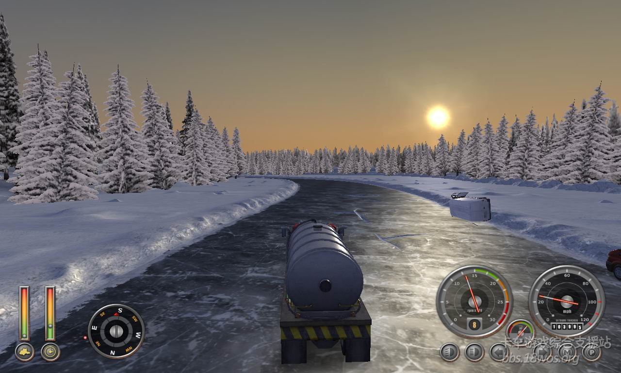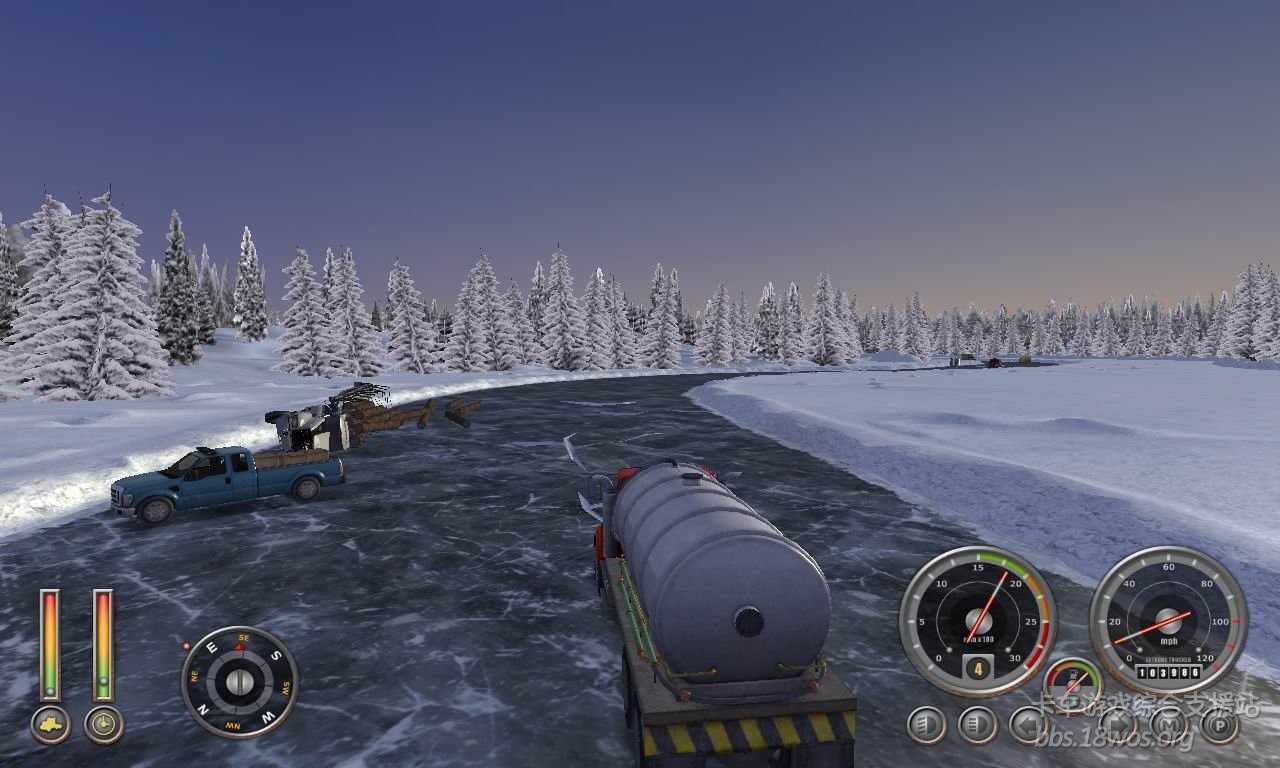 好久没过来看看了  发现一款 ET2 感觉不错  下载开始玩  在选区域时 毫不犹豫的选了加拿大  感觉雪景比较好看。。。。  开始还一切顺利  玩着玩着发现地图太牛了  走在开裂的冰面上还能听见吱呀~~吱呀~~的声音  听的我是毛骨悚然 生怕翻车再重新开始!!!看到路边的杯具哥我更是不安。。。 期间差点杯具。。。   一直到最后看到限定时间快到了 一脚油门踩到底 “老子不过了”  最后到货场 还是赶上了。。。  真让我蛋疼菊紧啊!!!!