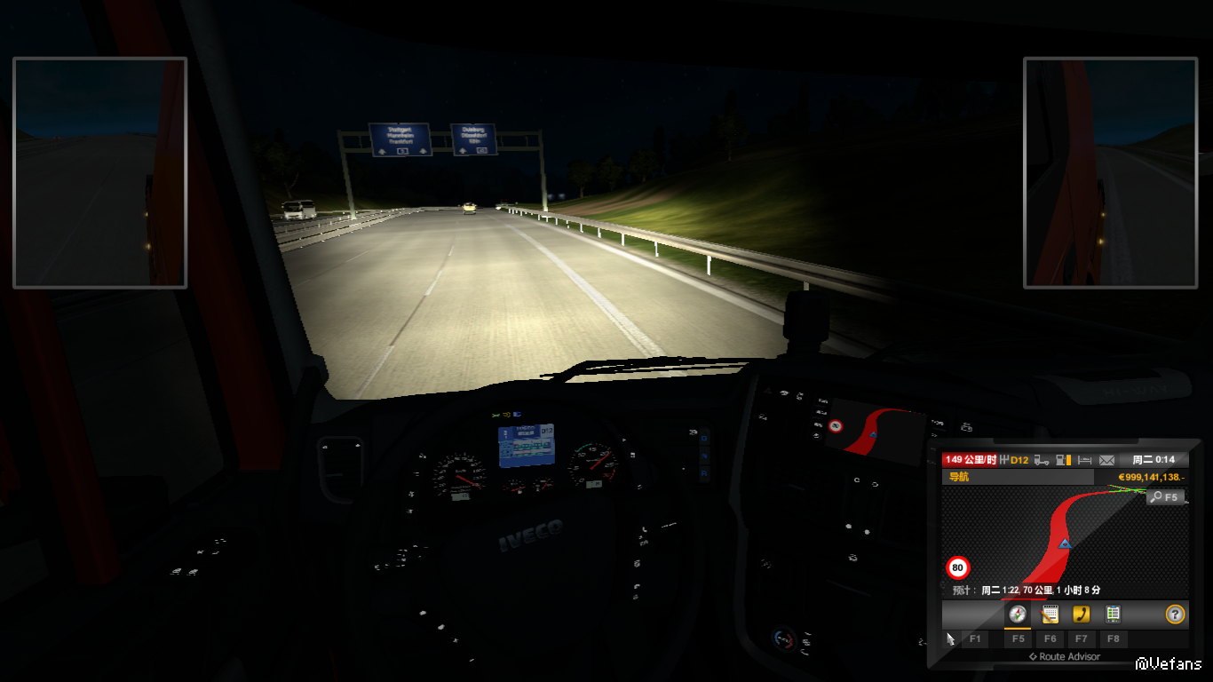 老司机近期深迷欧卡2,只是苦于等级低,财富少,每每苦奔波在欧洲。昨天下载了LIOyd.esp车友的30级,9.9亿存档,心中狂喜,买顶级依维柯深夜狂奔试车,高速149码,爽死!!!有图有真相: