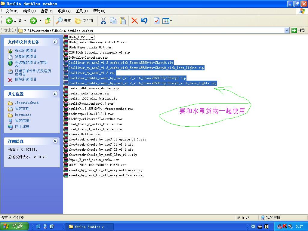 解压出来放进mod文件夹就可以了.前面的四个压缩包是配水果车和单双节货柜用的.要修改轮胎配置文件.