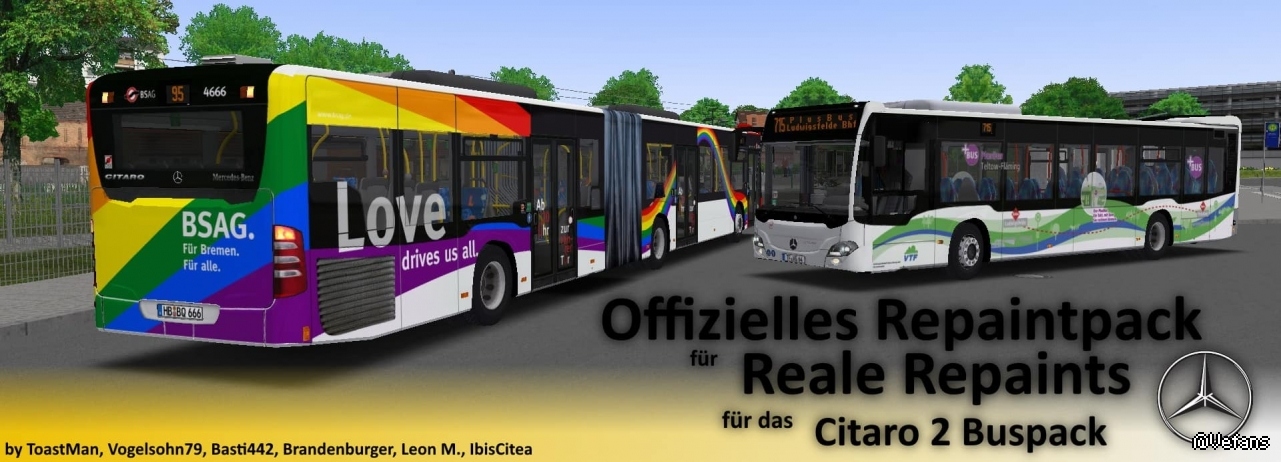 In diesem Pack sind einige reale Repaints für das Buspack von MX200 enthalten. Die Repaints wurden von einigen Repaintern erstellt. Reale Repaints für den MX200 C2 Repaintpack mit Grundlacken und Werbungen verschiedenster Firmen In diesem Repaintpack sind einige Lackierungen und Werbungen der C2 mitgeliefert, welche bis zum Zeitpunkt des Releases bzw. Fertigstellung des Archives existieren/existierten. Eine Auflistung, welche Werbungen und Lacke es für welche Busvarianten gibt, befinden sich im Spoiler unten. Die Repaints entstanden innerhalb eines größeren Zeitraums, weswegen teilweise auch die Qualität gewisser Stellen teils mangelhaft sind. Zusätzlich entstanden welche mit Zusammenarbeit mit ToastMan, Basti442, Brandenburger, Leon M, Vogelsohn79 und Bad hat Harry ツ. Hierfür danke ich nochmal. Sollten Fehler erkannt werden oder ihr wollt so einige Worte fassen, nutzt gerne die Kommentarsektion in der Webdisk.