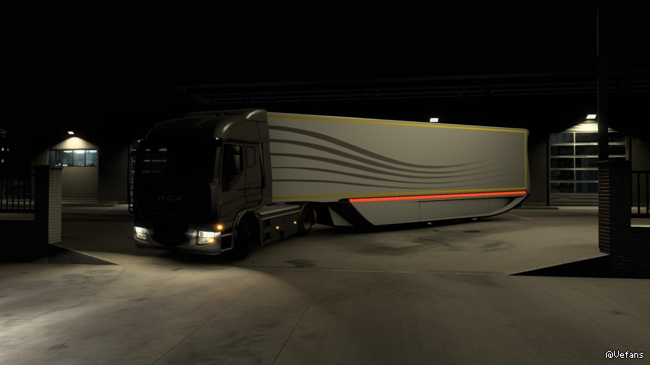 感觉该牵引车头的车顶的样子和拖车更搭配故如此组合,不过可惜该拖车模组只有增加奔驰和斯堪尼亚车头皮肤。
