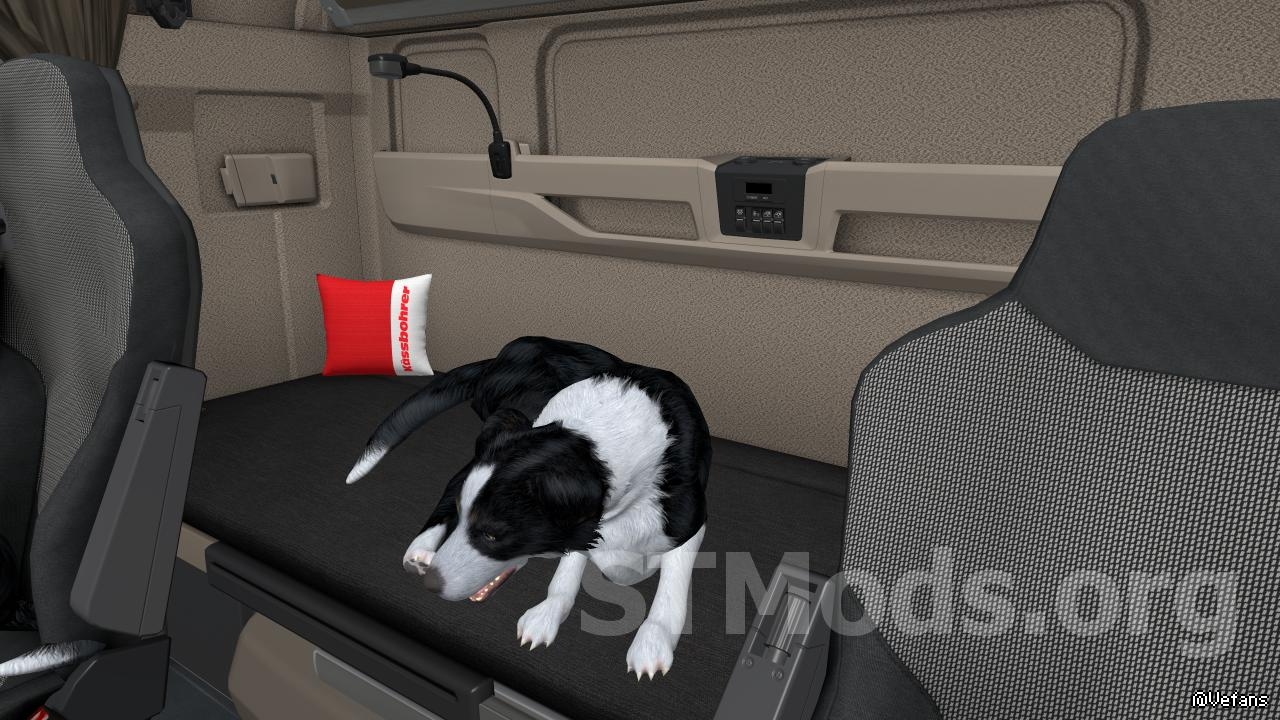 Мод добавляет три анимированных собаки для посадки их на пассажирское сидение или на спальник.