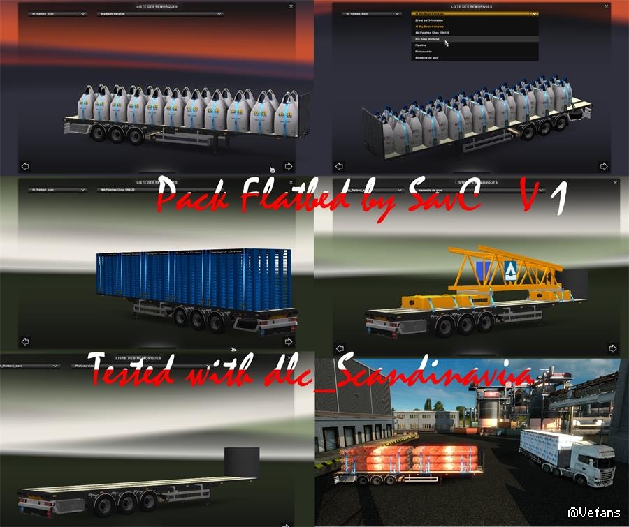 – This mod adds flatbed trailer with cargoes such as: isolation materials, big bags, pallets, empty, large pipes etc.