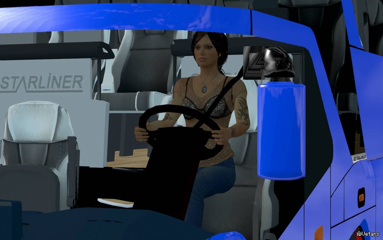 截图中的车是“欧洲 尼奥普兰豪华巴士 STARLINER EURO 5 V1.1”。开起来贼快的。用它截图主要是能看清楚驾驶员。