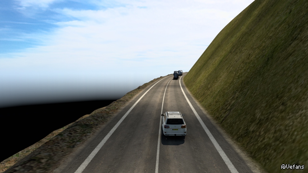 由于草地道路不平,无法开太快,一直开到大约这个地方,发现草地没有了,看得到一条道路悬在空中,从旁边终于可以上路了