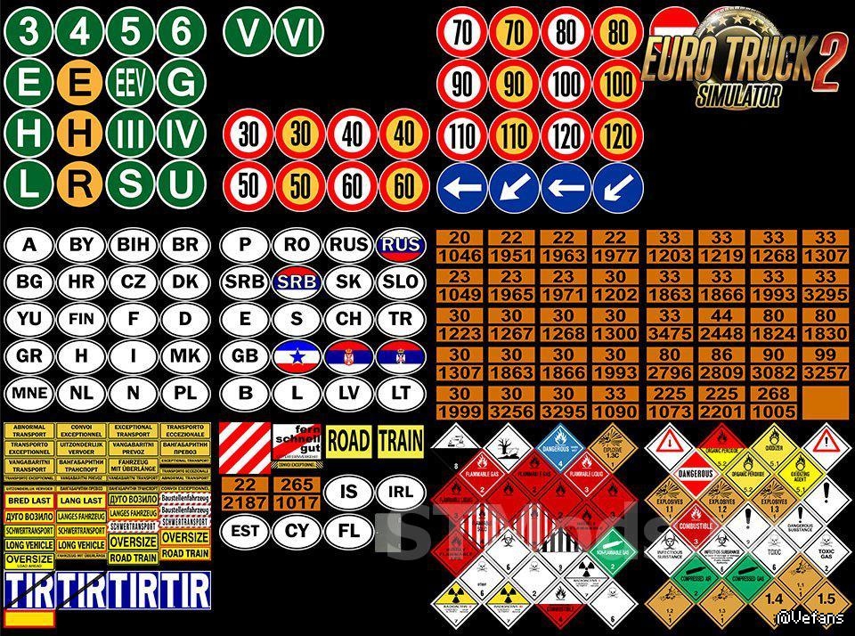 Мод добавляет 389 различных знаков и наклеек, знаки маркировки грузовиков в различных категориях, коды стран, ограничения скорости, предупреждения, экологические предупреждения и многие другие.