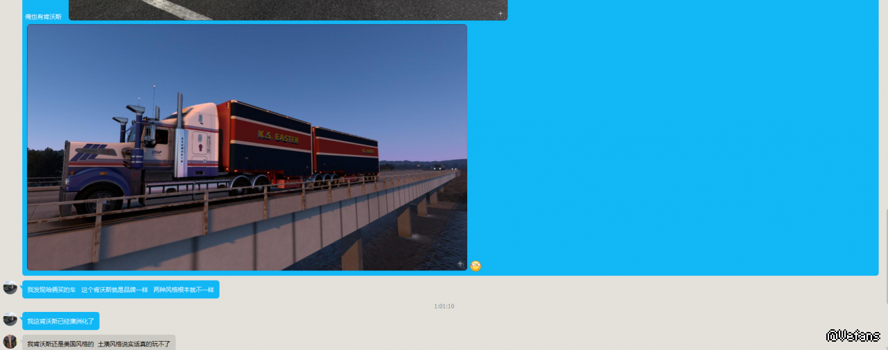 谢谢 我找了一大圈。这台车有人做,我这个挂现在没人做了。我看了很多作者卖的澳洲火车拖挂的基本绝迹了。好不容易找到了一个他还是一个做集装箱骨架车的作者。所以我这个车好看,和我这个拖挂有很大的关系的。澳洲车,拖美国挂会很违和,澳洲卡车的车头整流罩高,挂车鞍座高。拖个美国本土挂看着很别扭的,因为美国本土挂车,挂在这辆车上,他的货箱高度不够,比整流罩还矮很多,再说,美国的挂车连接处的地方和车头的间距是很大的 不紧凑。澳洲卡车还是要拖个澳洲的拖挂才有美感。