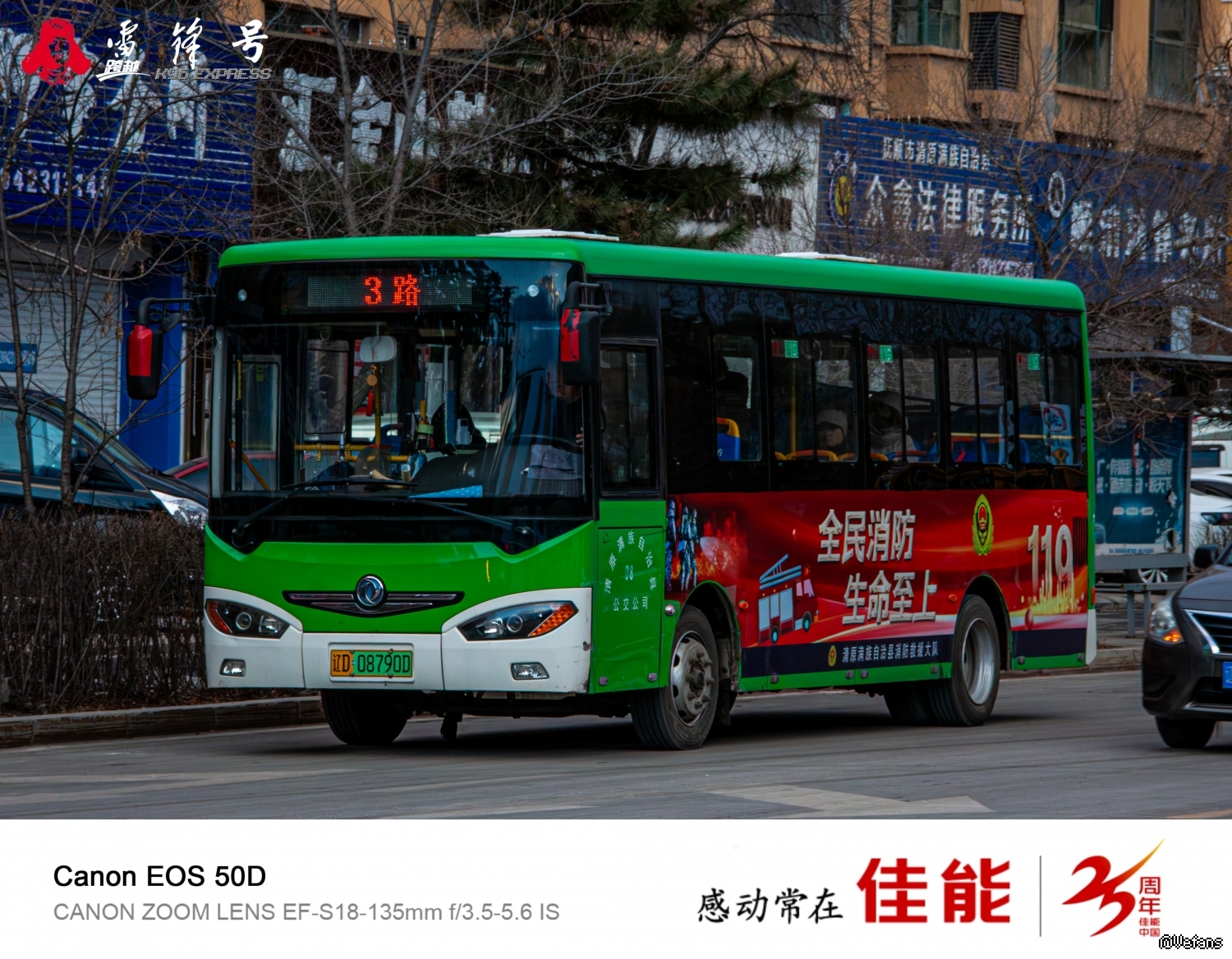 消防主题的公交线路为清原公交3路车,其中消防主题公交车为辽D·08790D,编号08,东风天翼