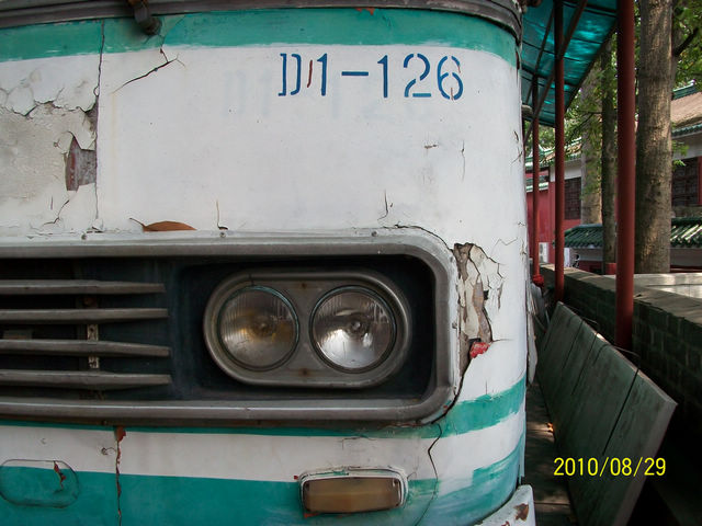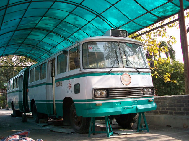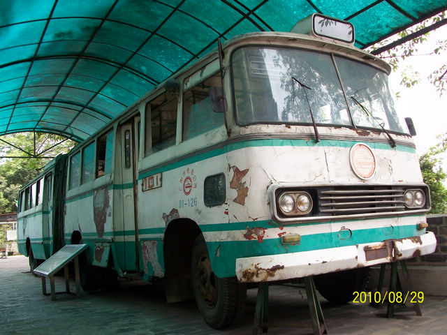 在广州越秀山上的广州博物馆里,停着一件藏品:1台铰接无轨电车.